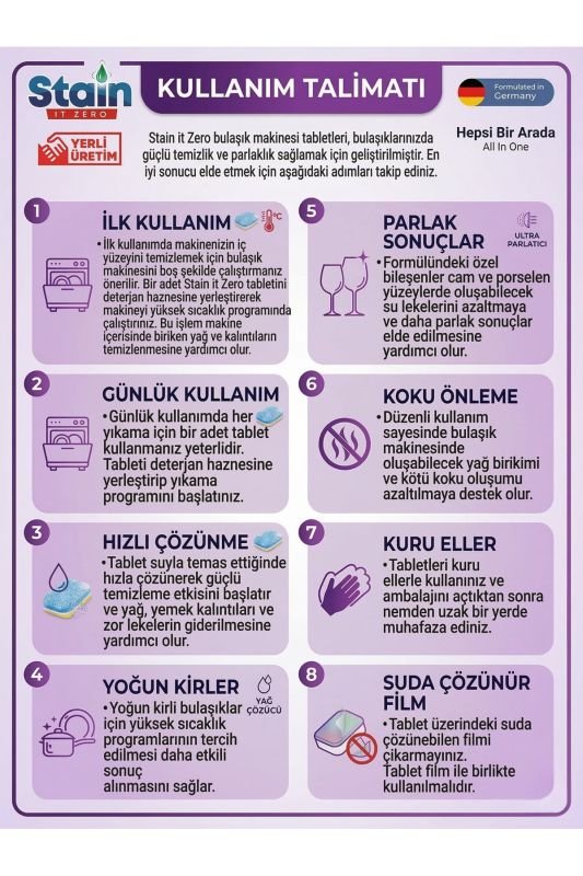 Stain it Zero Bulaşık Tableti, bulaşıklarınızı kolayca temizlerken çevre dostu formülüyle etkili ve pratik bir çözüm sunar. Güçlü yağ ve leke çıkarıcı etkisi sayesinde bulaşıklarınızda parlak ve temiz bir sonuç elde etmenizi sağlar. Bulaşık makinenizle mükemmel uyum içinde çalışan bu tabletler, su lekelerini ve kireci önleyerek bulaşıklarınızın uzun süre parlak kalmasına yardımcı olur.